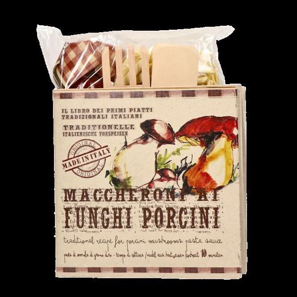 Kurze Maccheroni mit einem Sugo ai Funghi Porcini. Die Zubereitung wird in italienisch und in deu...