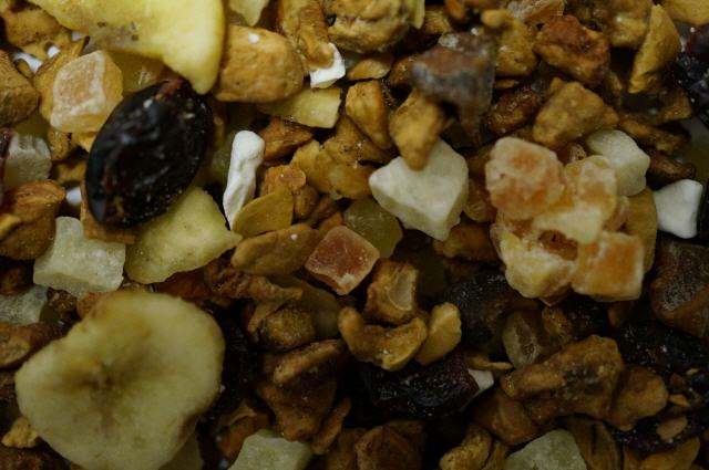 Apfelstücke, Papayastücke, Ananaswürfel, Cranberries, Birnenwürfel, Bananenchips, Mangostücke, Ar...