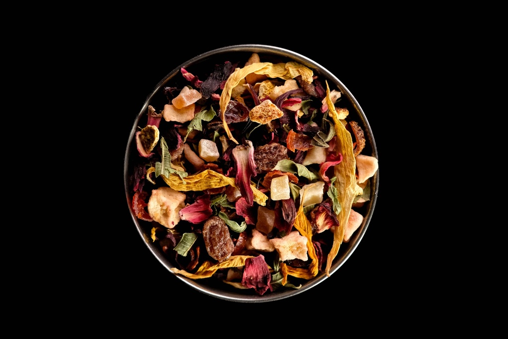 Zutaten: Basis (Hibiskus, Hagebutten, Korinthen, Apfelstücke, Ananasstücke (Ananas, Zucker), Papayastücke (Papaya, Zucker), Orangenschale, Mangostücke (Mango, Zucker)), Verveine, Sonneblumenblüten, Aroma