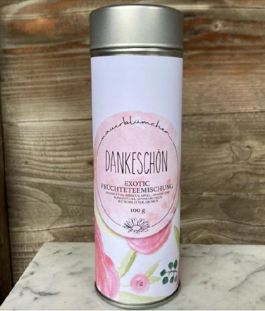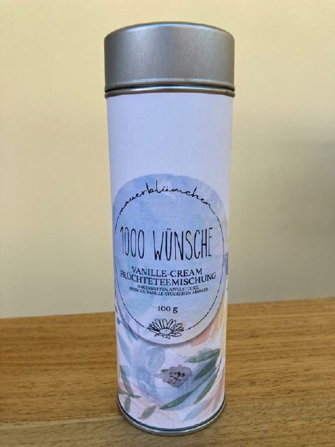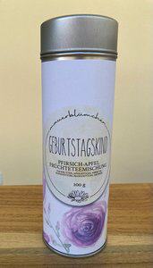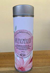 Teedose gefüllt mit 90g Himbeer-Kirsche Früchtetee (Zusammensetzung: Hibiscus, Korinthen, Holunde...