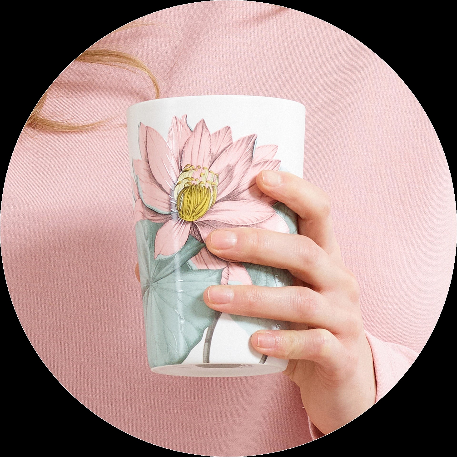 Der doppelwandige Porzellanbecher ist ein Handschmeichler mit haptischen Erlebnissen. Das große Edelstahlsieb mit aufwendiger Lochstanzung eignet sich zur optimalen Entfaltung des Teearomas.